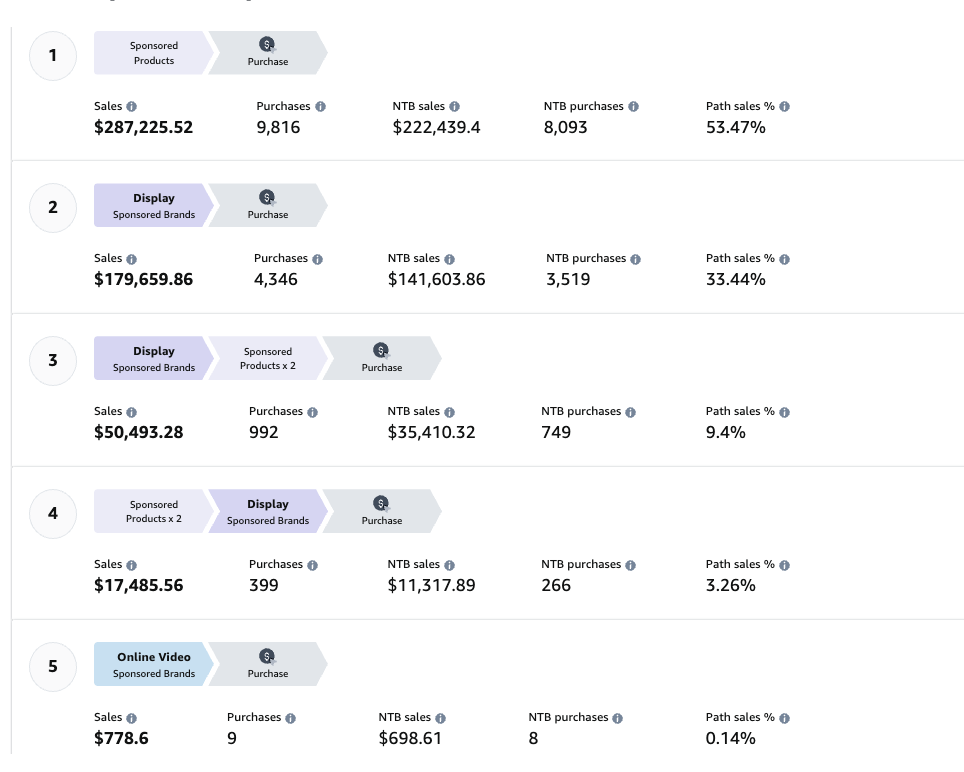 Accessed via Amazon Marketing Cloud (AMC), the NTB Trend Report will separate your Ad Sales by New-to-Brand (NTB) shoppers or repeat customers. This data, along with a well thought out Amazon marketing campaign structure, can show you which products/targets/campaign types are most successful at bringing in NTB shoppers.