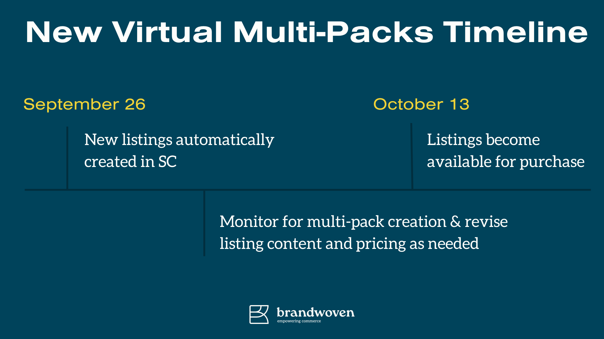 - Timeline: These new virtual multi-pack listings will be created by September 26, 2025 (may take up to 48 hours for the complete virtual multi-pack to appear in the catalog). They can be edited or deleted at any time and will be available for customers to purchase on October 13, 2025.