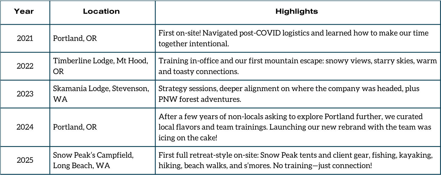 Each year, we design our on-sites to revisit and reinforce our core values. We ask big-picture questions and spend time connecting in meaningful ways. We use these on-sites to host trainings, share company updates, and roll out initiatives together.